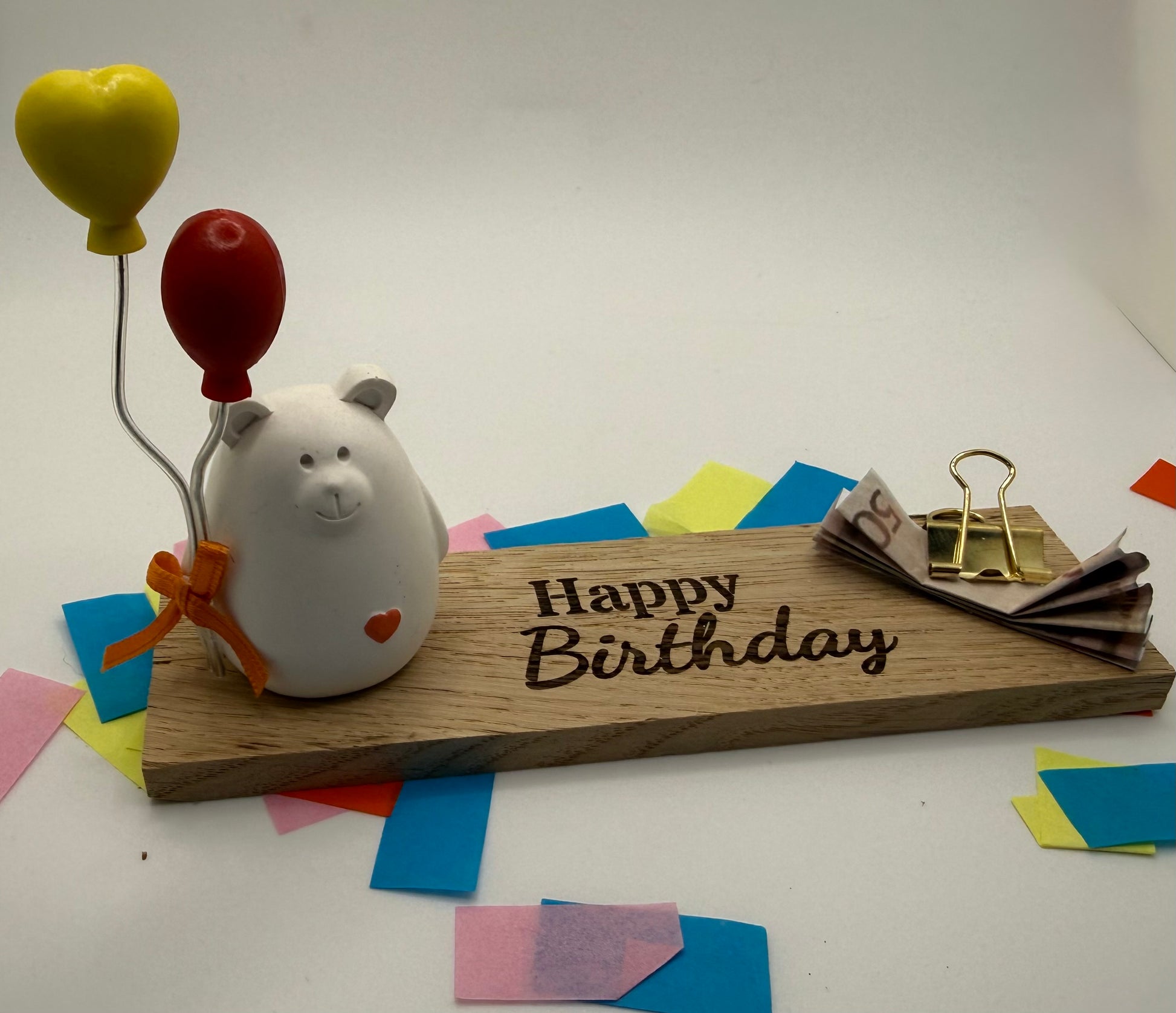 Auf einem natürlichen Holzsockel mit der Gravur „Happy Birthday“ hält das kleine Bärchen bunte Ballons – bereit, Geldscheine, Gutscheine oder liebe Worte stilvoll zu überreichen.
