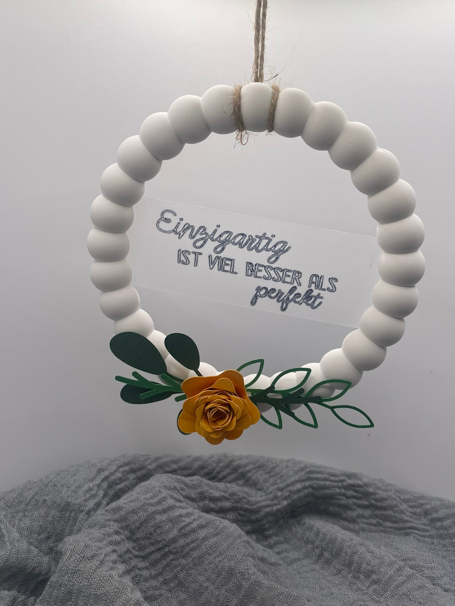 Hole dir den Frühling direkt nach Hause mit diesem liebevoll gefertigten Deko-Kranz aus Gipsperlen. Der schlichte weiße Ring wird von einer zarten gelben Blüte und grünen Blättern verziert – ein zeitloser Blickfang für deine Wand, Tür oder Fenster.