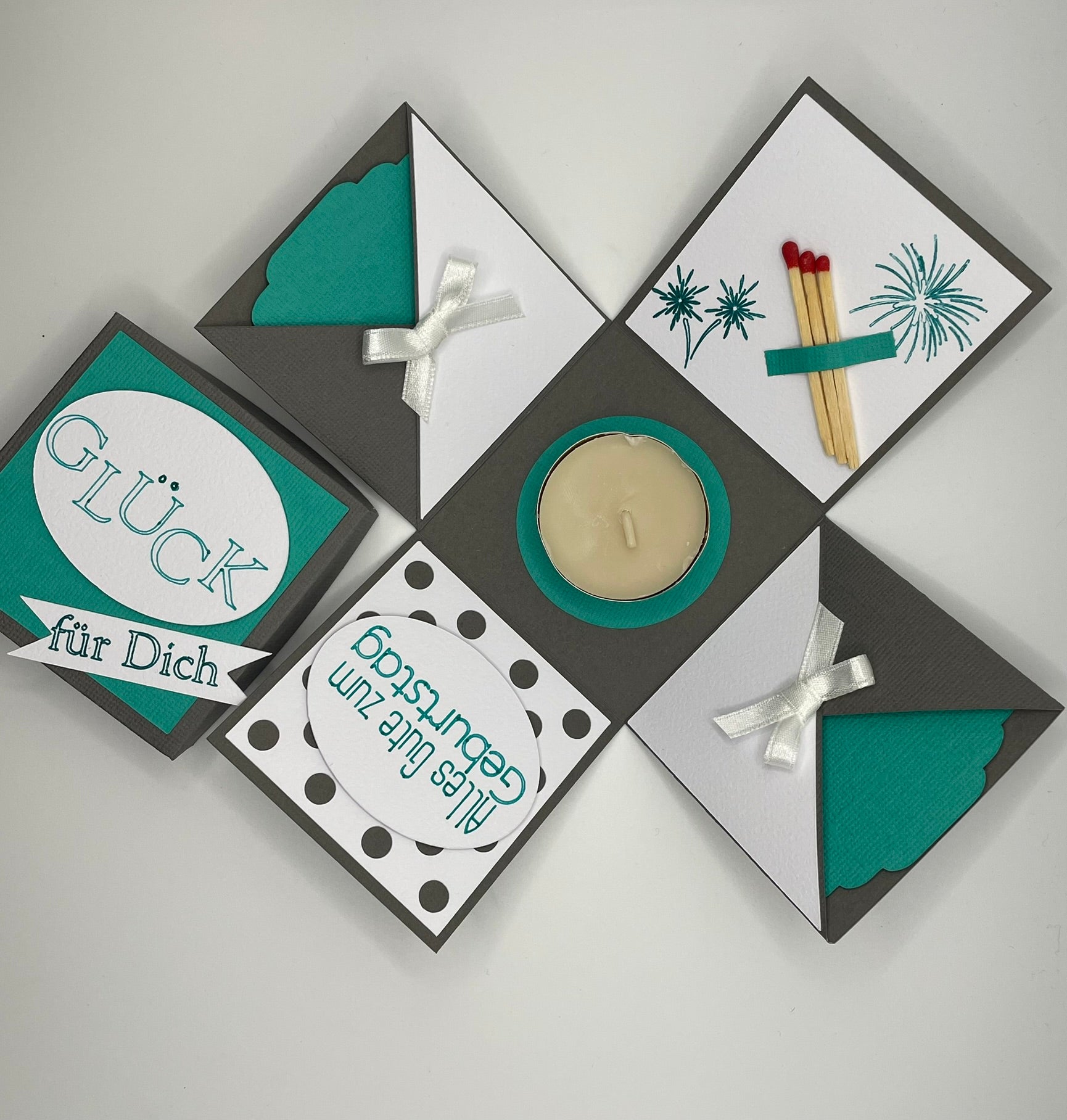 Diese handgefertigte Explosionsbox ist ein originelles und liebevolles Geschenk zum Geburtstag 🎉🥳. Beim Öffnen entfaltet sich die Box zu einer kleinen Überraschung voller Glückssymbole und nützlicher Details: