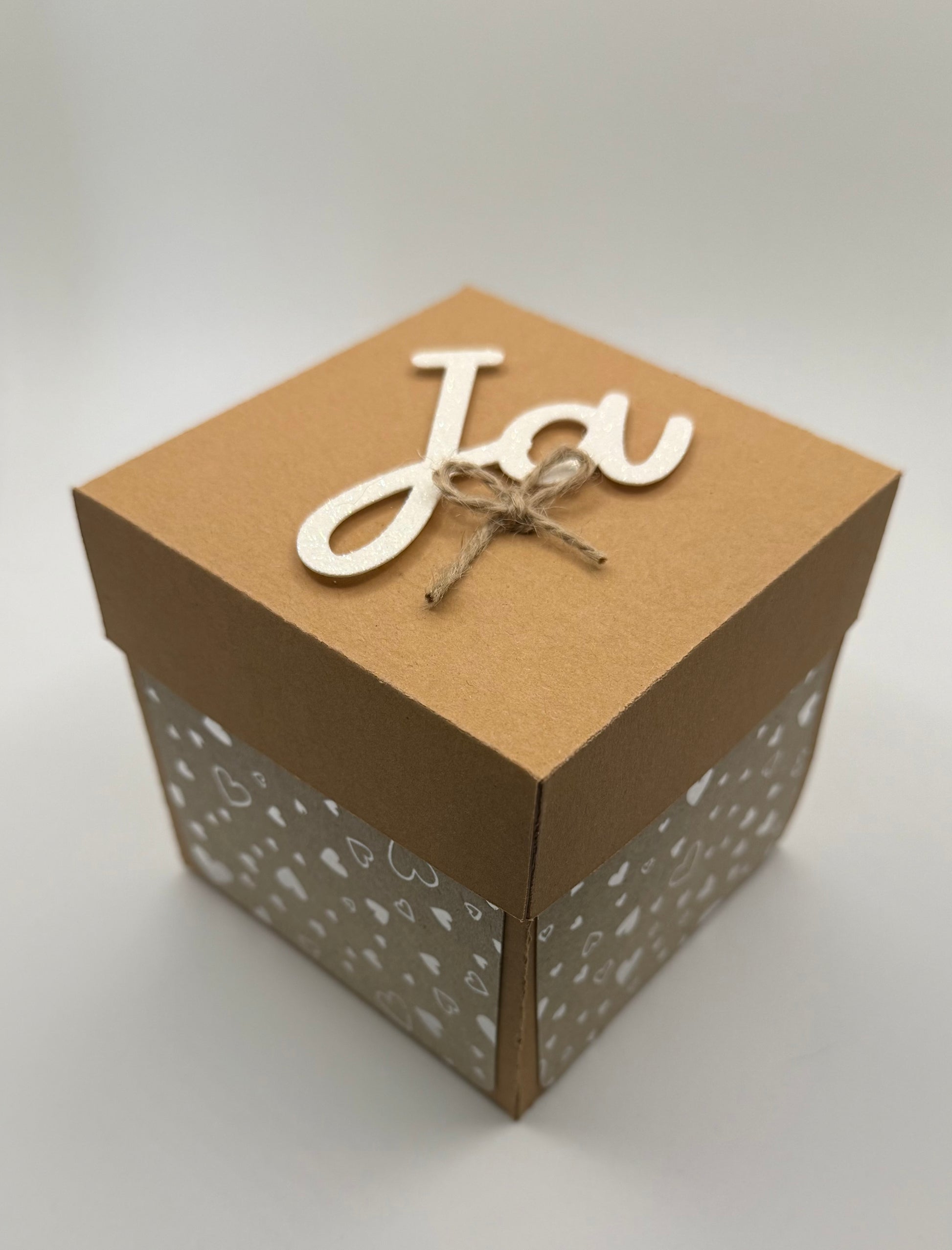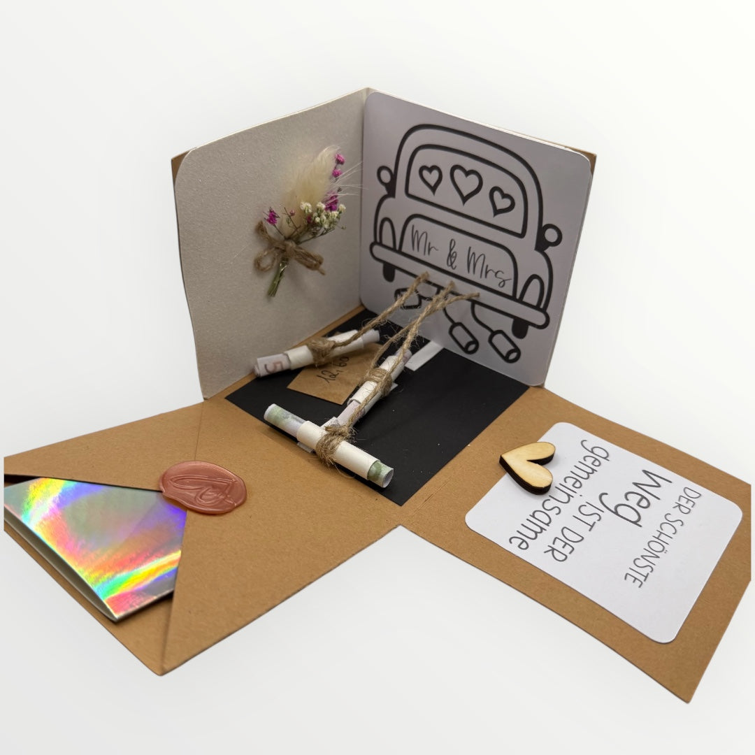 Ein liebevoll handgefertigtes Geldgeschenk zur Hochzeit, das nicht nur überrascht, sondern berührt. Diese Explosionsbox im Kraftpapier-Look zeigt beim Öffnen ein kleines 3D-Hochzeitsszenario mit dem typischen „Just Married“-Auto, an dem kleine „Geldrollen-Dosen“ hinterhergezogen werden – ein witziges und kreatives Highlight!