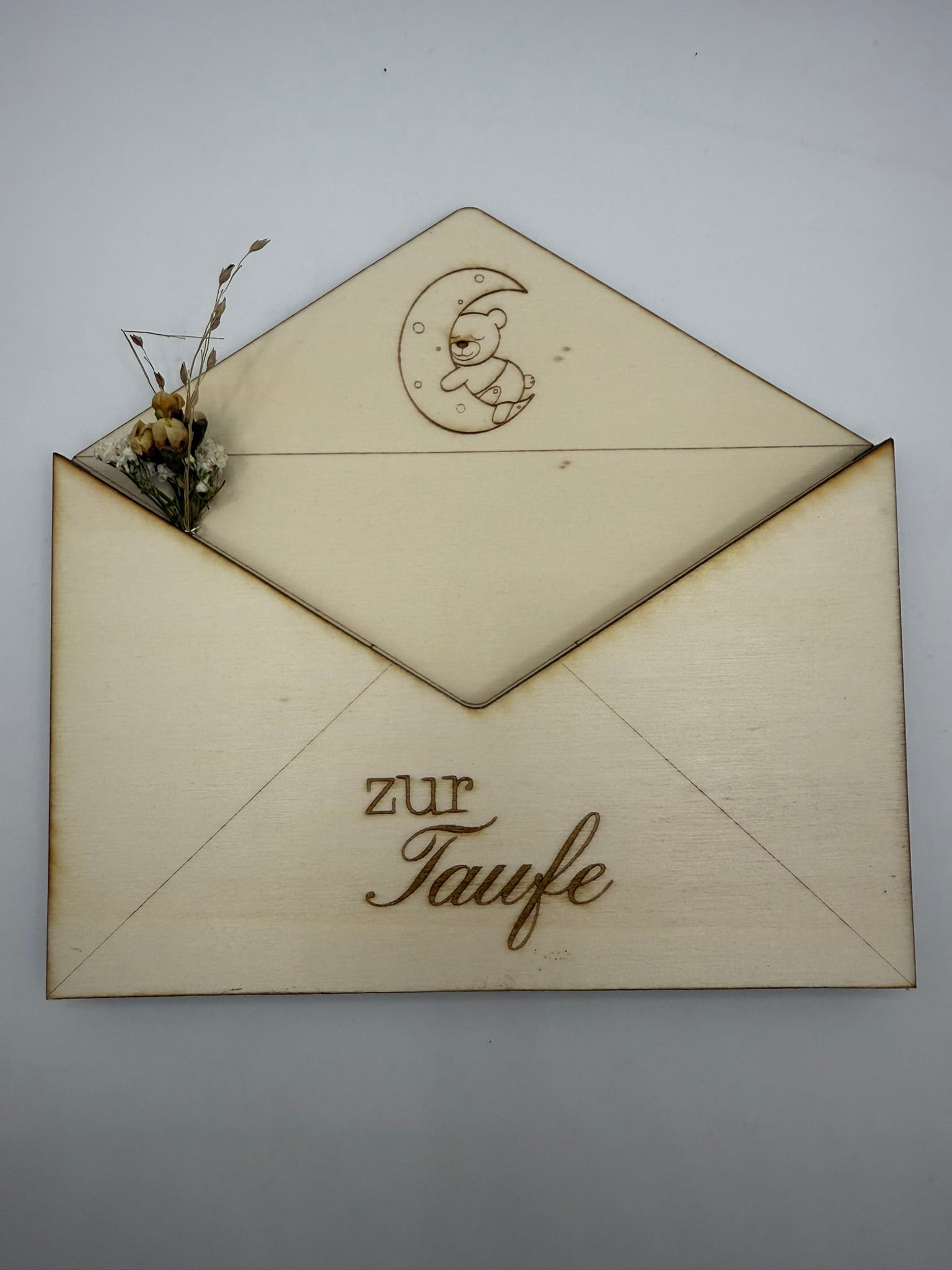 Ein zauberhafter Geldgeschenk-Umschlag aus Holz – perfekt, um zur Taufe liebevolle Wünsche und ein besonderes Geschenk zu überreichen 💌.