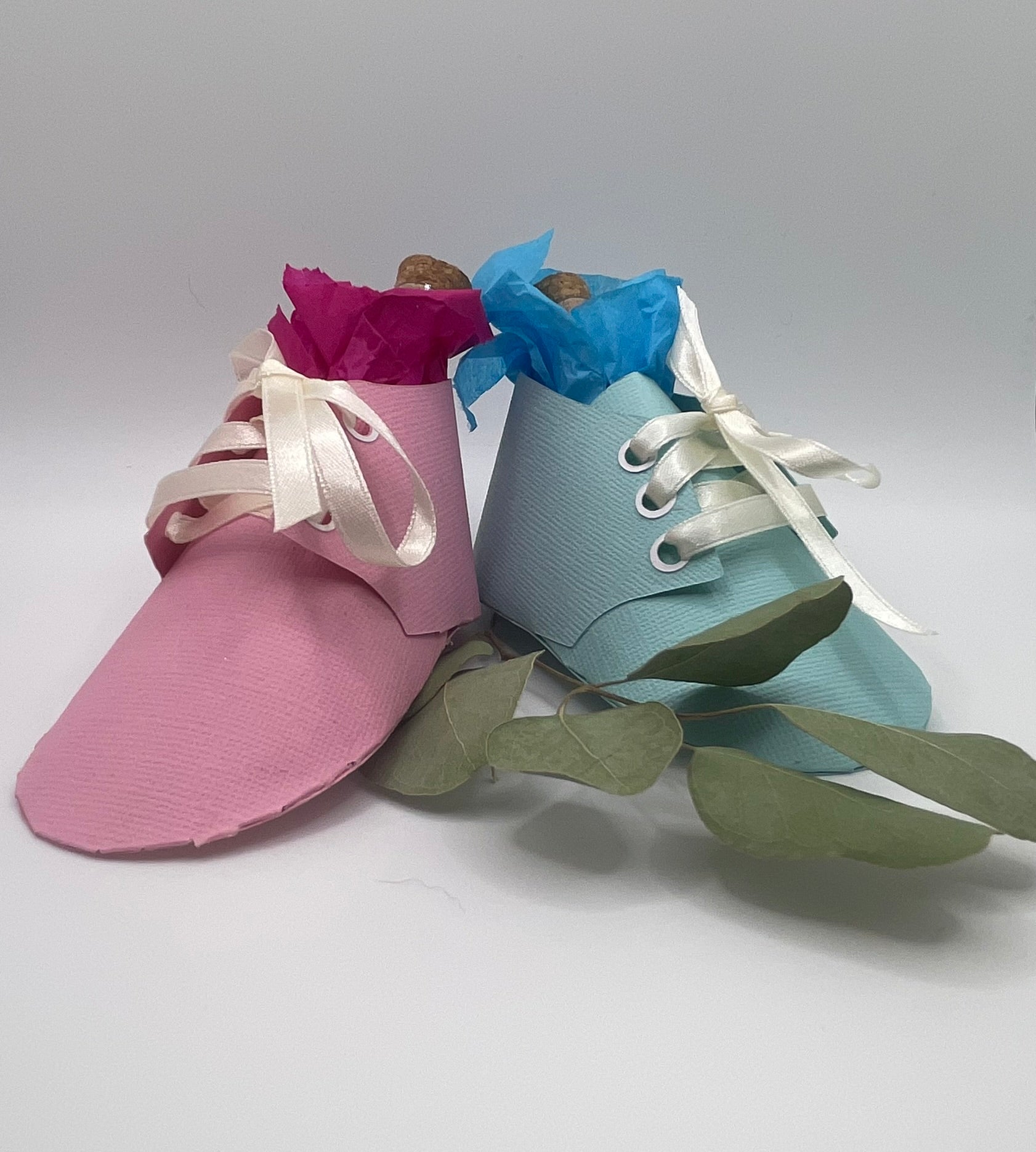 Ein bezauberndes Geschenk zur Geburt oder Taufe: Diese niedlichen, handgefertigten Papierschühchen in Rosa und Hellblau sind mit viel Liebe zum Detail gestaltet – inklusive Satinbändchen und farblich passendem Seidenpapier. Im Inneren versteckt sich ein Glasröhrchen mit Korken, perfekt, um Geld, Glückwünsche oder kleine Botschaften zu überreichen.