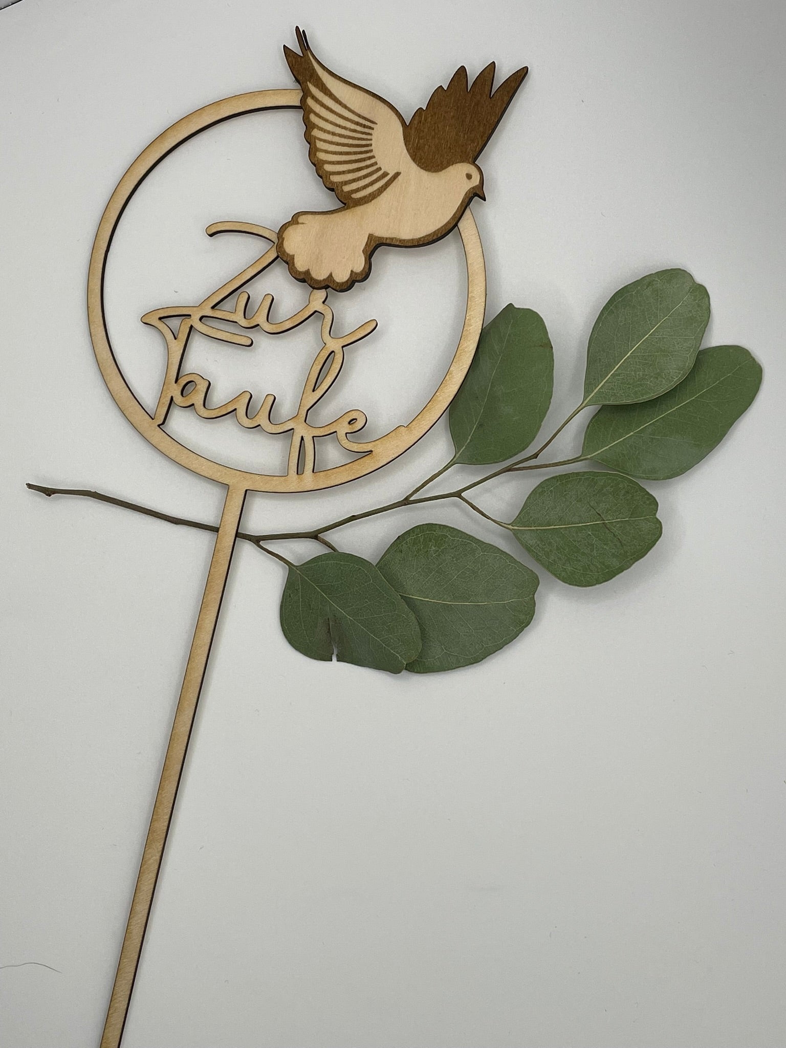 Dieser filigrane Kuchentopper trägt den Schriftzug „Zur Taufe“ in eleganter Schrift, umrahmt von einem zarten Kreis.