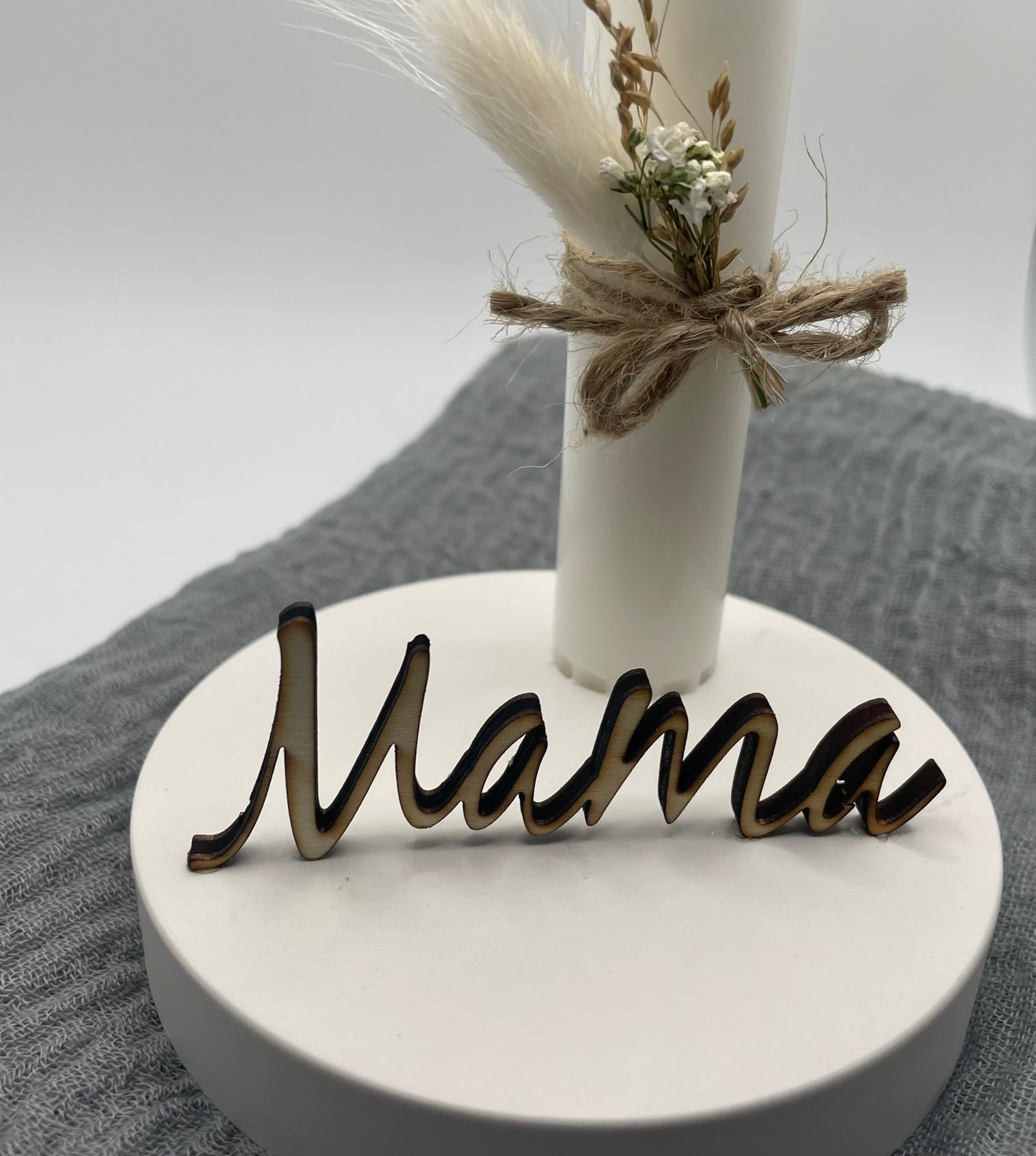 Der schlichte, runde Sockel aus hochwertigem Material trägt den eleganten „Mama“-Schriftzug aus Holz. Die weiße Kerze ist mit einem kleinen roten Herz verziert ❤️ und wird durch einen zarten Trockenblumenstrauß mit Juteband liebevoll abgerundet.