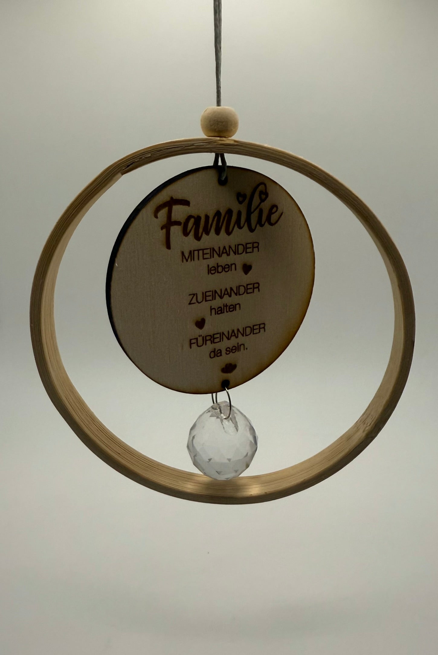 Ein wunderschönes Wohn- und Geschenk-Accessoire, das die Bedeutung von Familie in liebevollen Worten festhält 💖. In einem schlichten Holzring hängt eine runde Holzscheibe mit der Gravur: