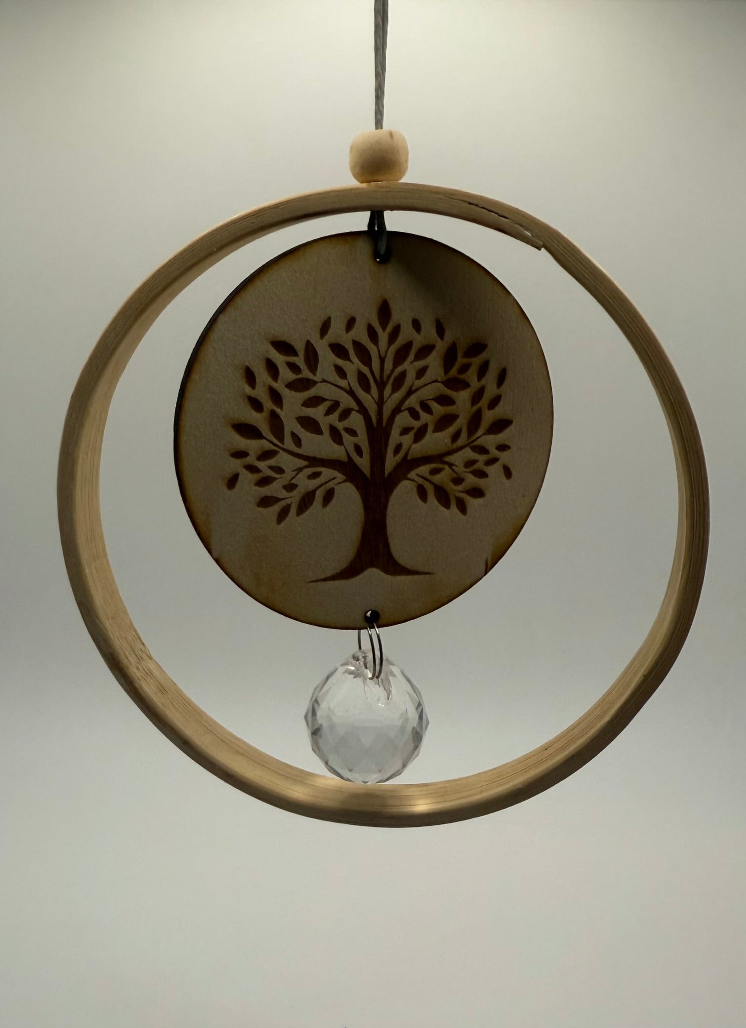 Darunter schimmert ein edler Kristallanhänger 💎, der das Licht einfängt und kleine Regenbogen in den Raum zaubert 🌈. Ob als Dekoration im Fenster, an der Wand oder als Geschenk – dieses Stück strahlt Wärme, Zusammenhalt und Geborgenheit aus.
