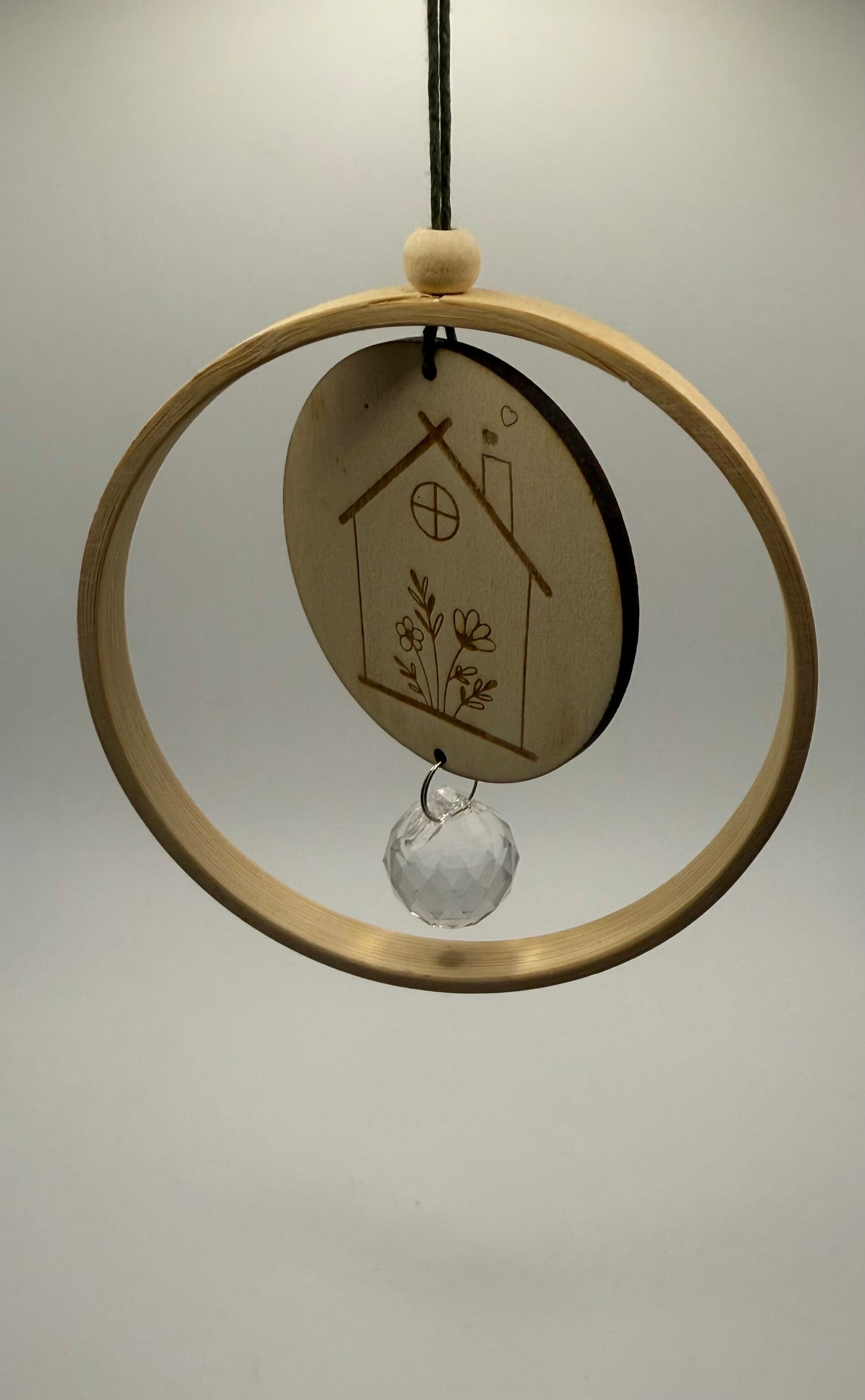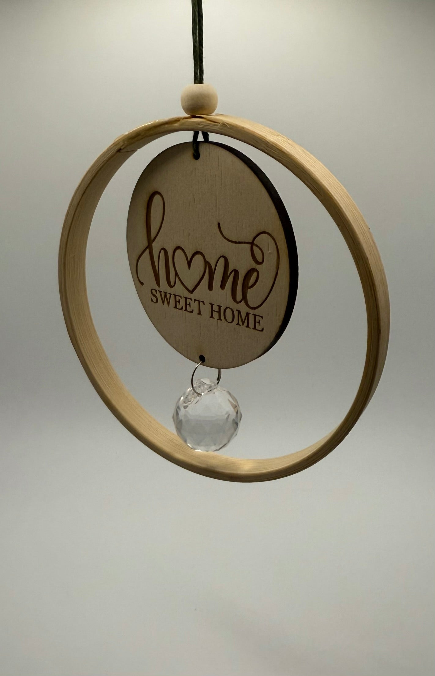 Unterhalb des Schildes hängt ein funkelnder Kristallanhänger 💎, der das Licht wunderschön bricht und kleine Lichtreflexe in den Raum zaubert 🌈. Ob am Fenster, an der Wand oder als Geschenk zum Einzug – dieses Stück versprüht pure Wohlfühlatmosphäre.