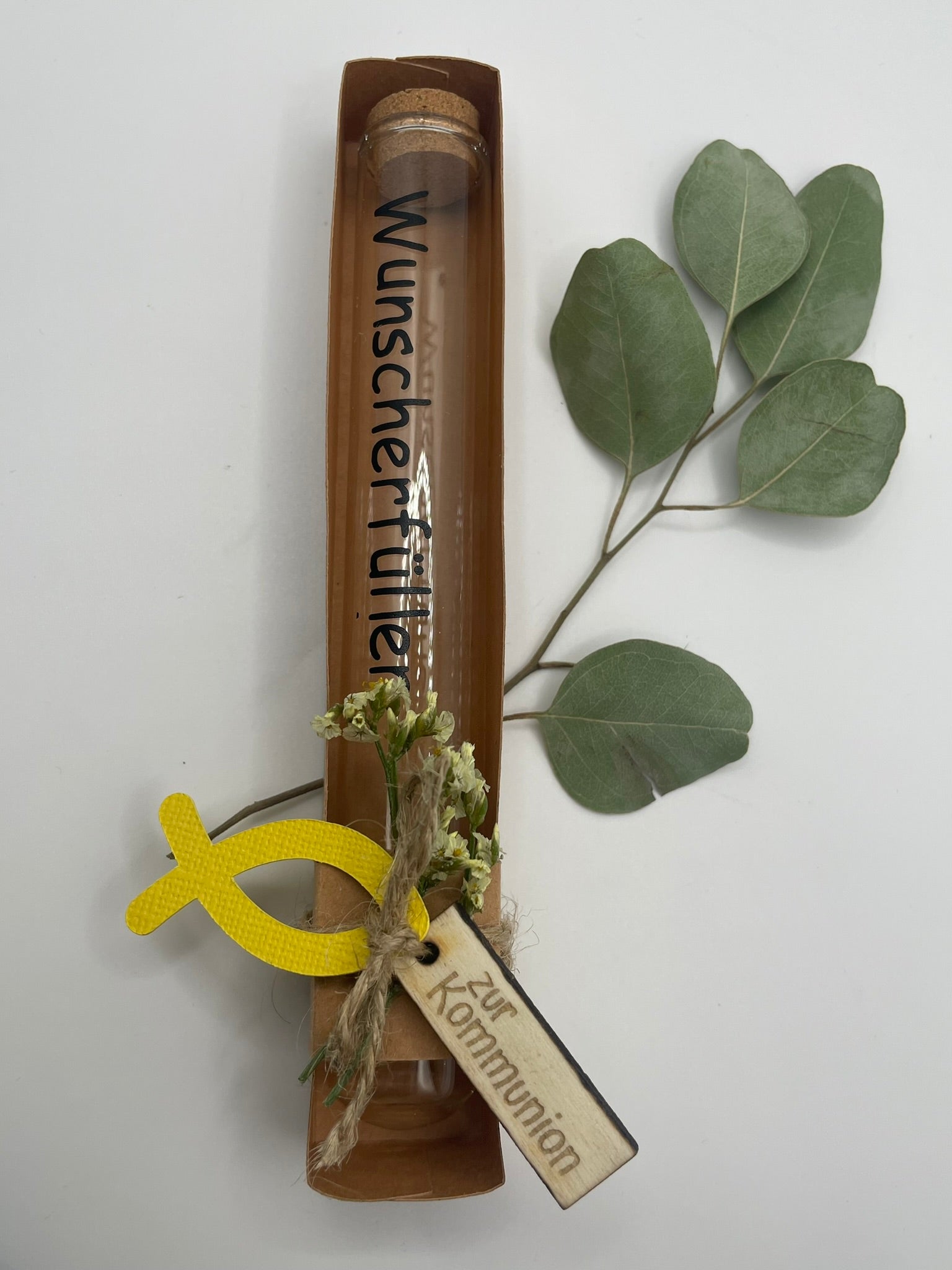 Ein kleines Geschenk mit großer Bedeutung – unser Wunscherfüller ist eine liebevolle Aufmerksamkeit zur Kommunion 💛. Das filigrane Glasröhrchen im Holzhalter kann mit Geldscheinen, guten Wünschen oder kleinen Botschaften gefüllt werden, um dem Beschenkten ein Lächeln ins Gesicht zu zaubern.